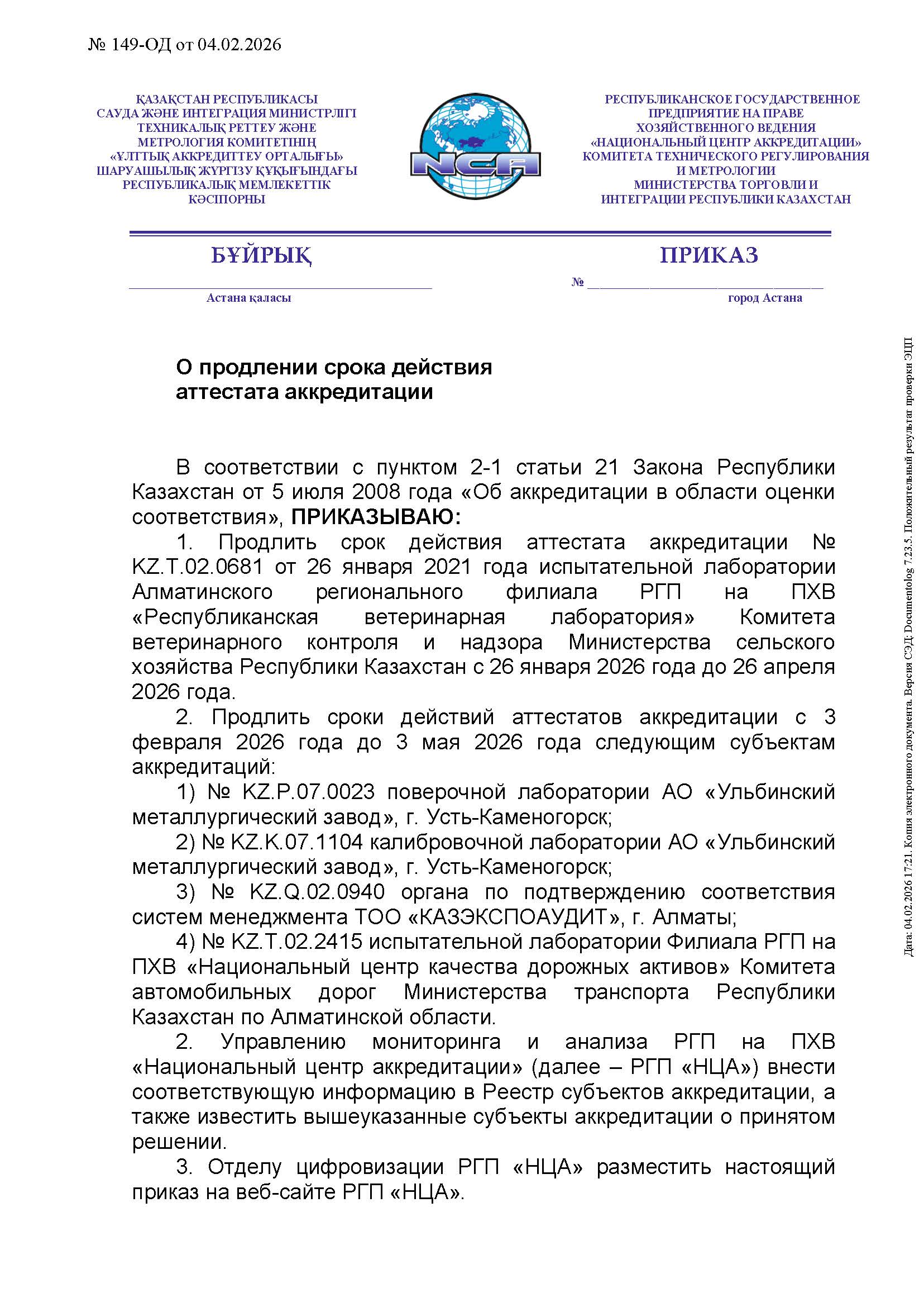 Приказ № 149-ОД от 04.02.2026 г. О продлении срока действия аттестата аккредитации