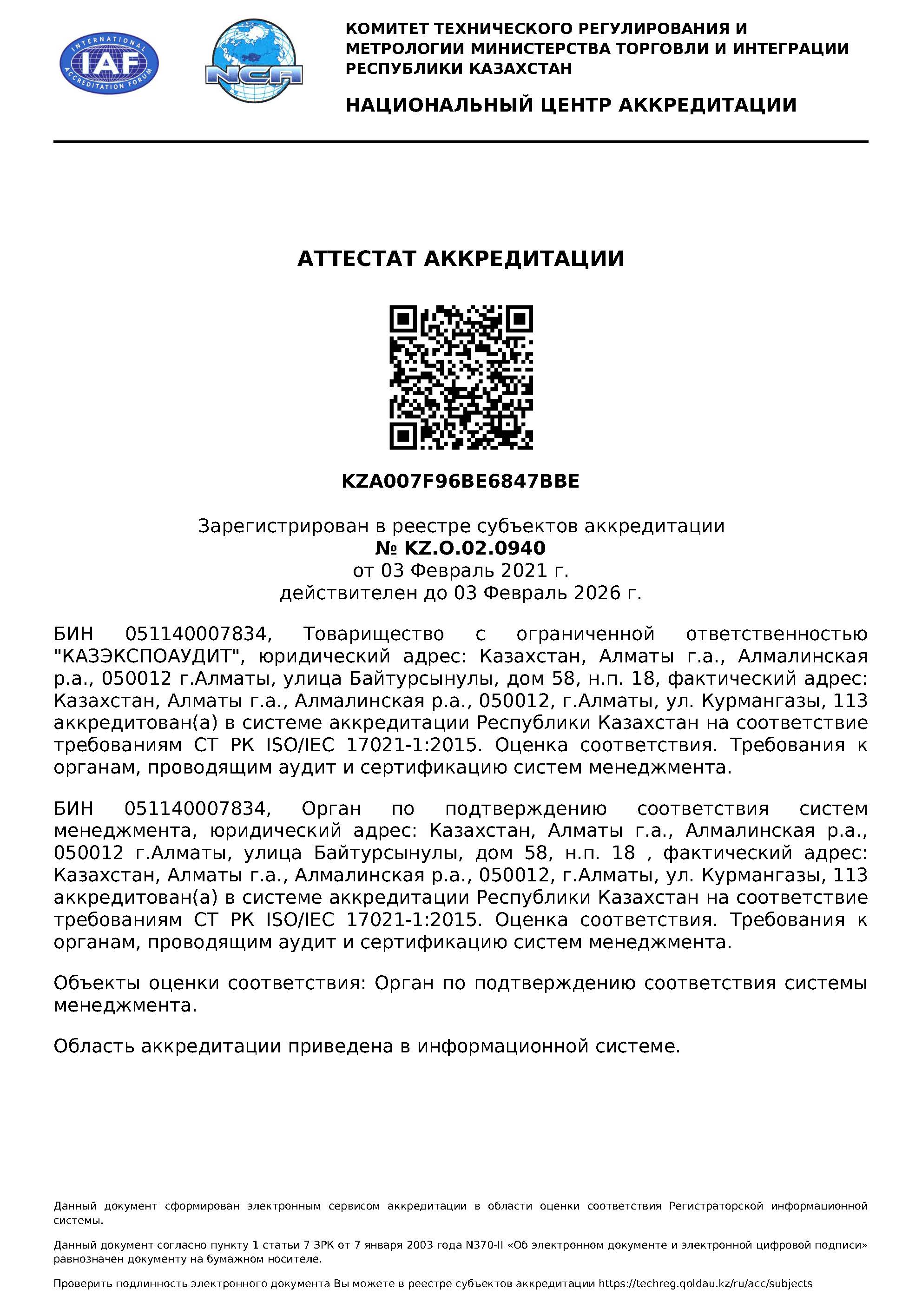 Электронный аттестат Аккредитации ОПС ТОО «КАЗЭКСПОАУДИТ»